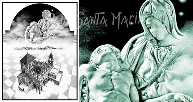 A photo-realistic pencil drawing of Michelangelo's Pieta and Escher's "Ascending and Descending" - no computer trickery was used to create this!