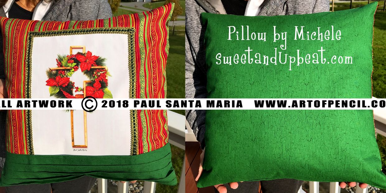 With a beautiful Christmas wreath and gilded cross painted by Paul Santa Maria, this pillow is sure to warm up your home this year! It can be different color combinations to make yours a one-of-a-kind! Use the contact form below to ask for this pillow with different colors or any other question you may have about our pillows! ~ Michele